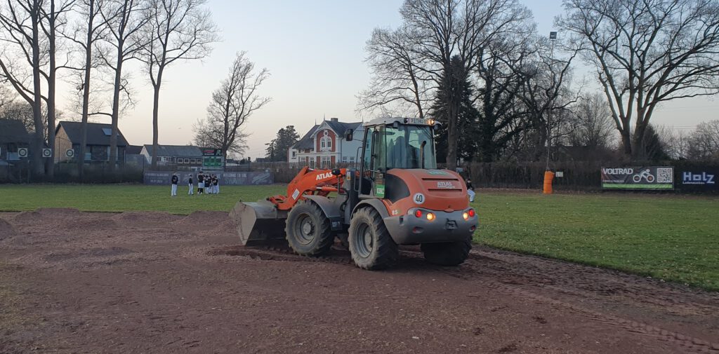 Anfang 2025 war es soweit, die LKWs sind angerollt und haben große Haufen Grand auf der Baseballanlage an der Kaltenweide abgeschüttet. Ganz im Sinne der Nachhaltigkeit wurde nicht neuer Grand gekauft sondern recycelt. Ein aufgegebener Fußballplatz wurde „abgeschält“ und anstatt den Belag zu entsorgen hat das zuständige Bauunternehmen eine Möglichkeit der Weiterverwertung gesucht. Glücklicher Abnehmer sind die Elmshorn Alligators. Die Baseballsparte des EMTV suchte schon seit Jahren nach einer kostengünstigen Möglichkeit ihren abgetragenen Platz aufzufrischen. Um das Glück rund zu machen, bekommen die Alligators noch 16t Ziegelmehl als Deckschicht von der Tennisabteilungen des EMTV und vom Lawn-Tennis-Club.